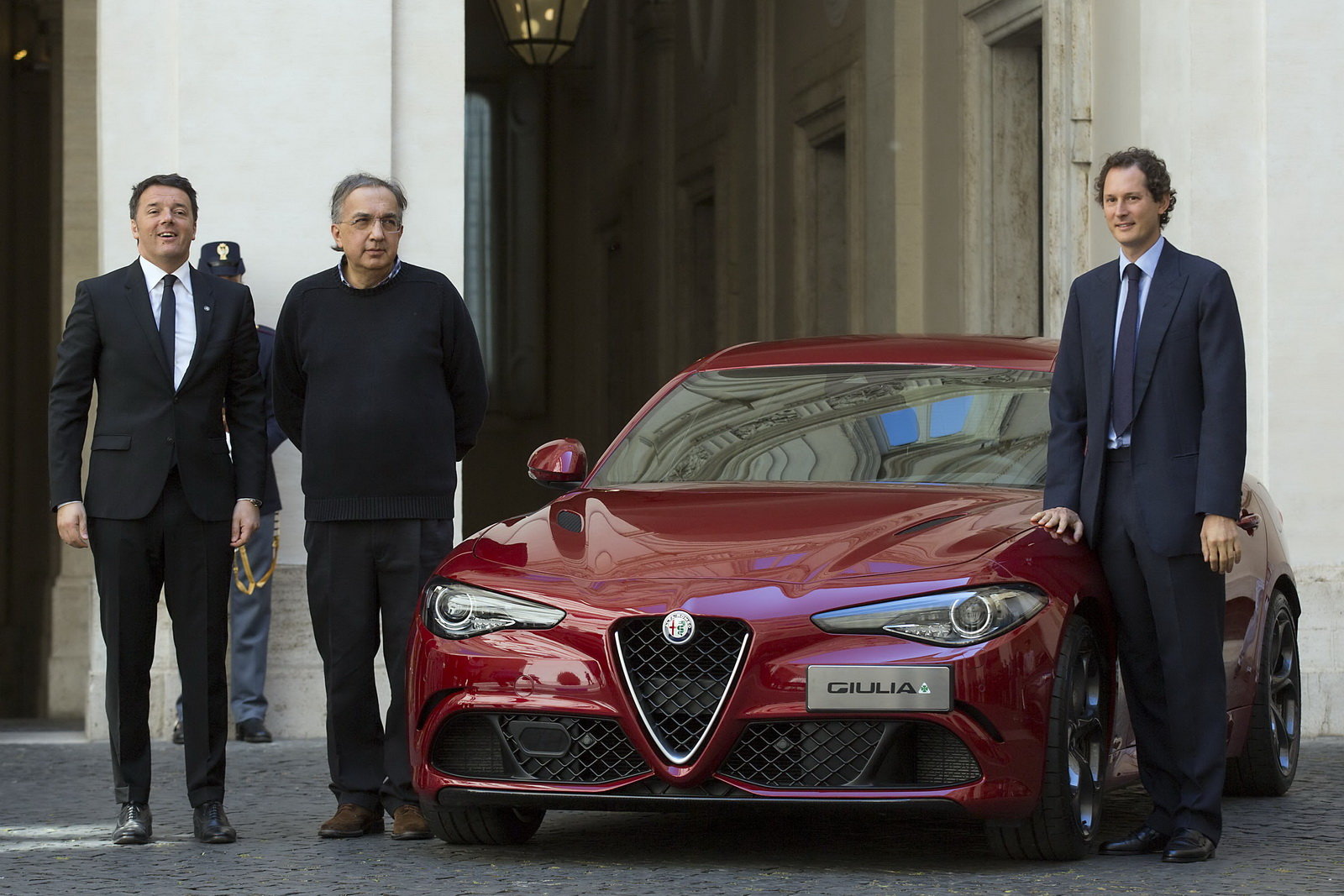 John Elkann e Sergio Marchionne hanno presentato la Giulia ai vertici delle istituzioni. Sottolineati da Renzi gli impegni produttivi in Italia.