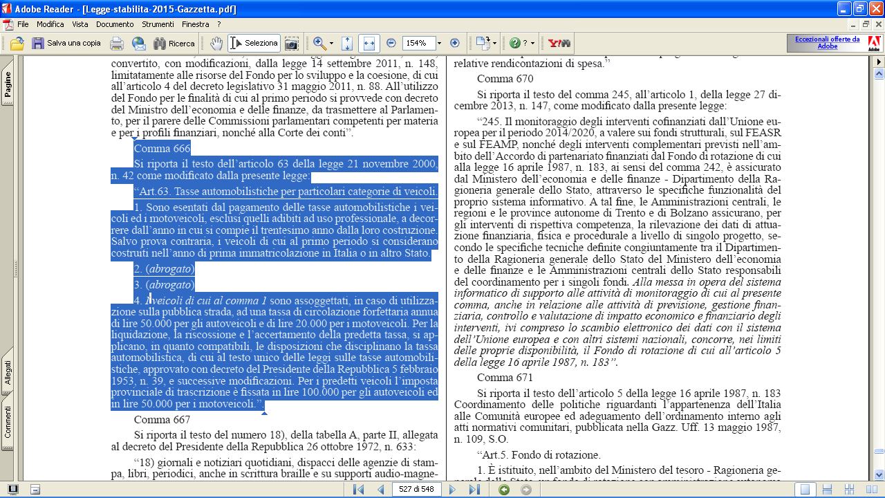 qui). Con la legge di stabilità 2015, il governo Renzi consente alle regioni di abolire le agevolazioni per le macchine di età compresa fra i 20 e i 30 anni. Ora, in aggiunta al fatto che le regioni stesse non hanno ancora deciso come comportarsi, e quindi regna il caos, spunta pure un errore. Vediamo la norma pubblicata sulla Gazzetta Ufficiale, nel supplemento ordinario numero 99, pagina 523: al comma 666 è riportato un riferimento normativo a una