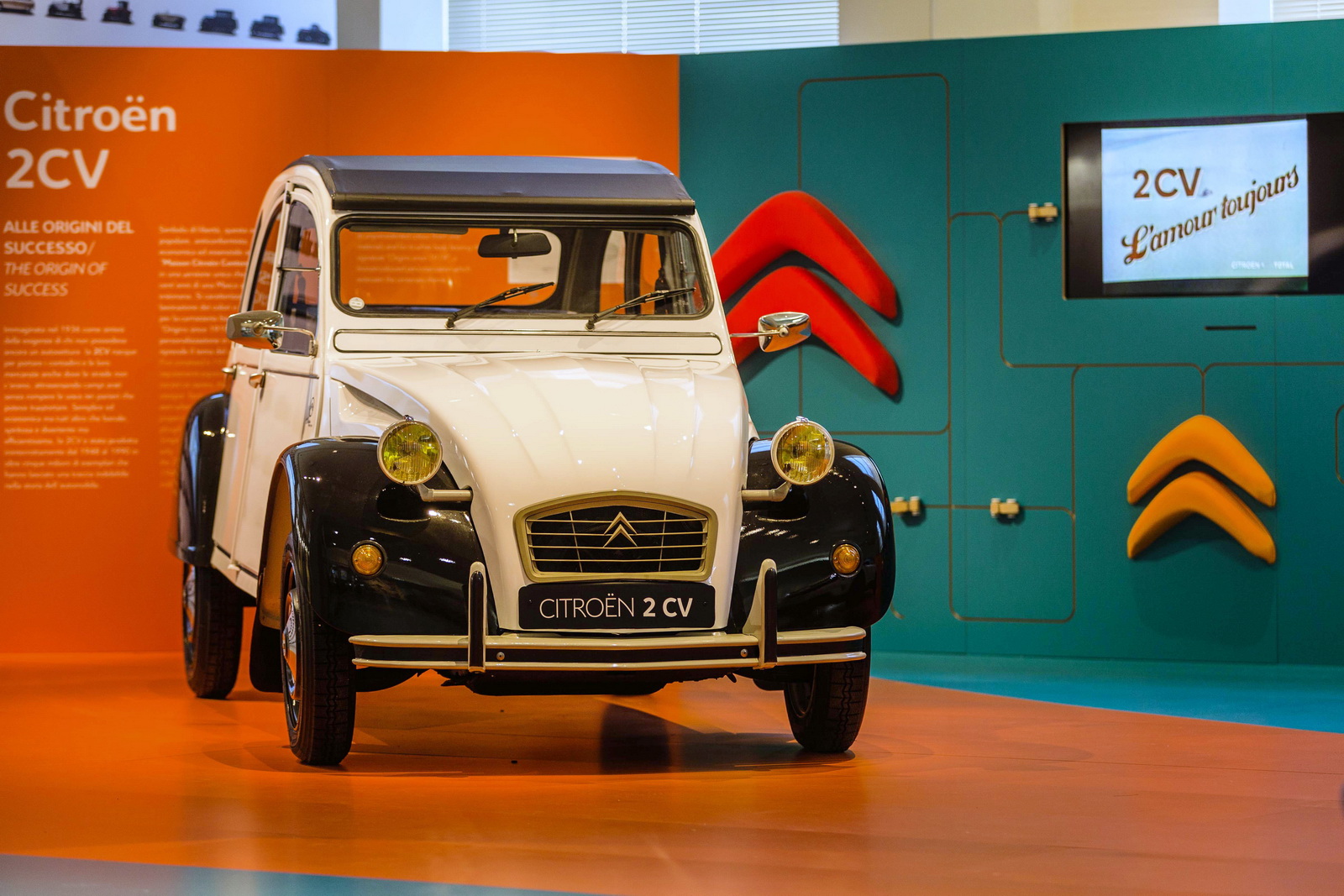 “INGANNA” L’OCCHIO - All’interno dell’allestimento, domina la scena un’imponente scultura realizzata con diversi componenti delle auto che insieme danno forma al famoso Double Chevron, il logo che da sempre identifica le vetture della Citroën. Questa creazione, chiamata Made With Icons, è realizzata dal designer Jean-Baptiste Sénéquier; disposta in una bacheca a muro, realizza il marchio francese con un “collage” di 263 elementi presi dalla produzione “storica” e recente del costruttore (tra cui il volante della C4 Picasso, la strumentazione della Visa e il fanale di una GS). L’effetto è particolare, e merita una visita: in lontananza, si nota solo la forma del Double Chevron, ma a mano a mano che ci si avvicina si distinguono sempre più chiaramente i singoli pezzi delle vetture.