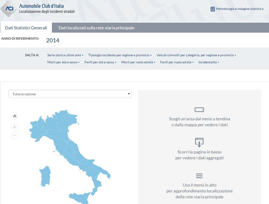 PER AREA O STRADA - I dati vengono forniti su due livelli: una sezione del sito è riservata all’area geografica, quindi i numeri vengono circoscritti in relazione al territorio nazionale, regionale o provinciale; l’altra sezione fornisce le statistiche in base alla rete viaria, dove si potrà scoprire il numero esatto di incidenti su autostrade, strade regionali e strade provinciali. Su lis.aci.it sono presenti tavole dedicate agli incidenti totali e mortali; ai veicoli coinvolti in relazione alla macro categoria d’appartenenza (auto, camion, moto, etc); alle persone coinvolte, suddivise per età, sesso e conseguenze dell’incidente; al numero ed al tipo di incidente per categoria di strada. Solo a livello provinciale, inoltre, è possibile accedere ad informazioni relative il giorno della settimana e l’ora.