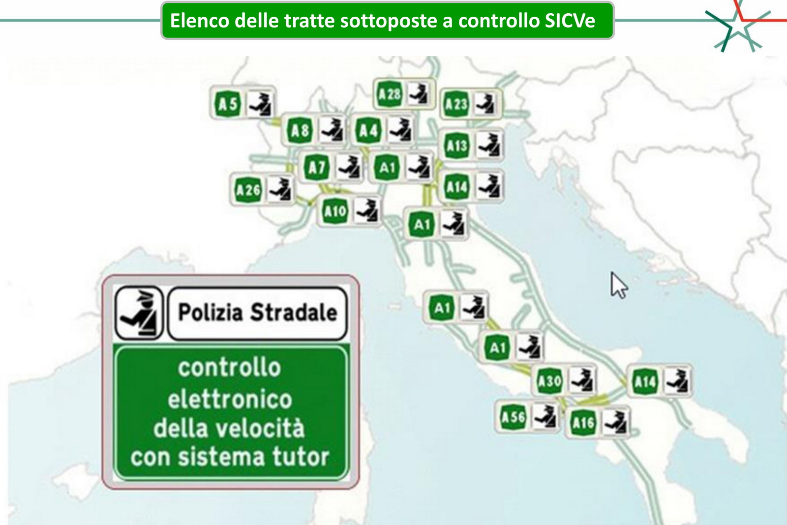 LE TRATTE ATTIVE - Attualmente il nuovo sistema SICVe copre circa 1.060 km di autostrade, interessando molte tratte che saranno percorse dagli automobilisti durante l’esodo estivo. La Polizia Stradale ha diffuso una mappa (vedi il disegno qui sopra e la galleria fotografica) che indica dove sono posizionati i dispositivi Tutor, che interessano le seguenti autostrade: A1, A4, A5, A7, A8, A10, A13, A14, A16, A23, A26, A28, A30 e A56. Sull’A1, l’autostrada del Sole, sono attive 17 tratte in direzione nord (tra cui Caserta Nord-Santa Maria Capua Vetere, Magliano in Sabina-Orte e Modena sud-Modena nord) e 11 in direzione sud (tra Fidenza e Santa Maria Capua Vetere). Sull’A10 è attivo un punto tra Celle Ligure ed Albisola in entrambe le direzioni est e ovest. Sull’A14, 12 in direzione nord (tra Bari Nord e Borgo Panigale; di cui fanno parte Forlì-Faenza e Faenza-Ravenna) e 12 in direzione sud (tra Faenza e Bitonto, comprese le tratte Cesena-Valle del Rubicone, Molfetta-Bitonto).