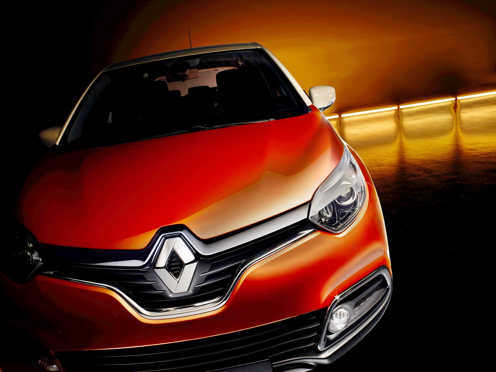 Renault Captur, dominata dalla grande losanga contornata da due listelli verniciati in nero lucido che si raccordano ai gruppi ottici sfuggenti. La presa d’aria inferiore si sviluppa a tutta larghezza mentre i fendinebbia sono incastonati in una cornice cromata. Da notare gli archi dei montanti, il tetto e gli specchietti retrovisori verniciati in bianco panna a contrasto con l’arancione della carrozzeria.