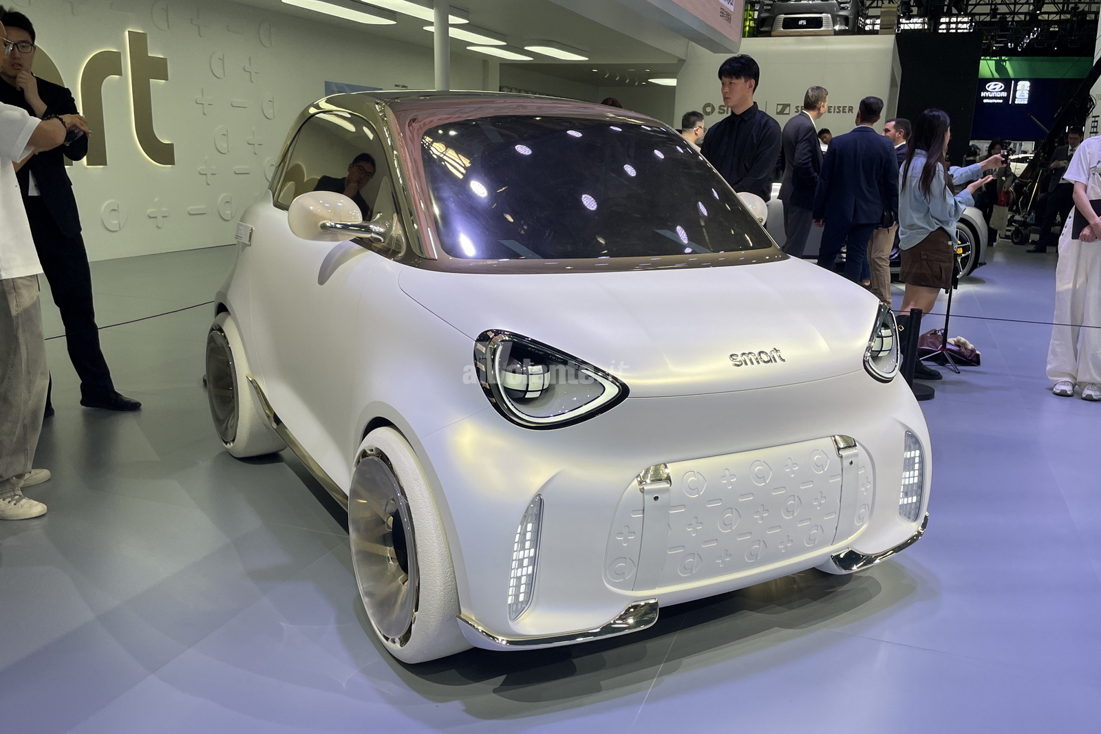 Lungo le fiancate si nota l’assenza di maniglie visibili e l’integrazione di specchietti retrovisori di tipo tradizionale. La parte posteriore riprende il tema circolare dei gruppi ottici, che appaiono come anelli luminosi incastonati nelle bombature dei parafanghi, mentre il tetto sembra galleggiare sopra la linea di cintura. L’impressione generale è quella di un oggetto di design minimalista ma ricco di personalità, capace di unire l’eredità storica del marchio Smart con un linguaggio estetico proiettato verso il futuro.