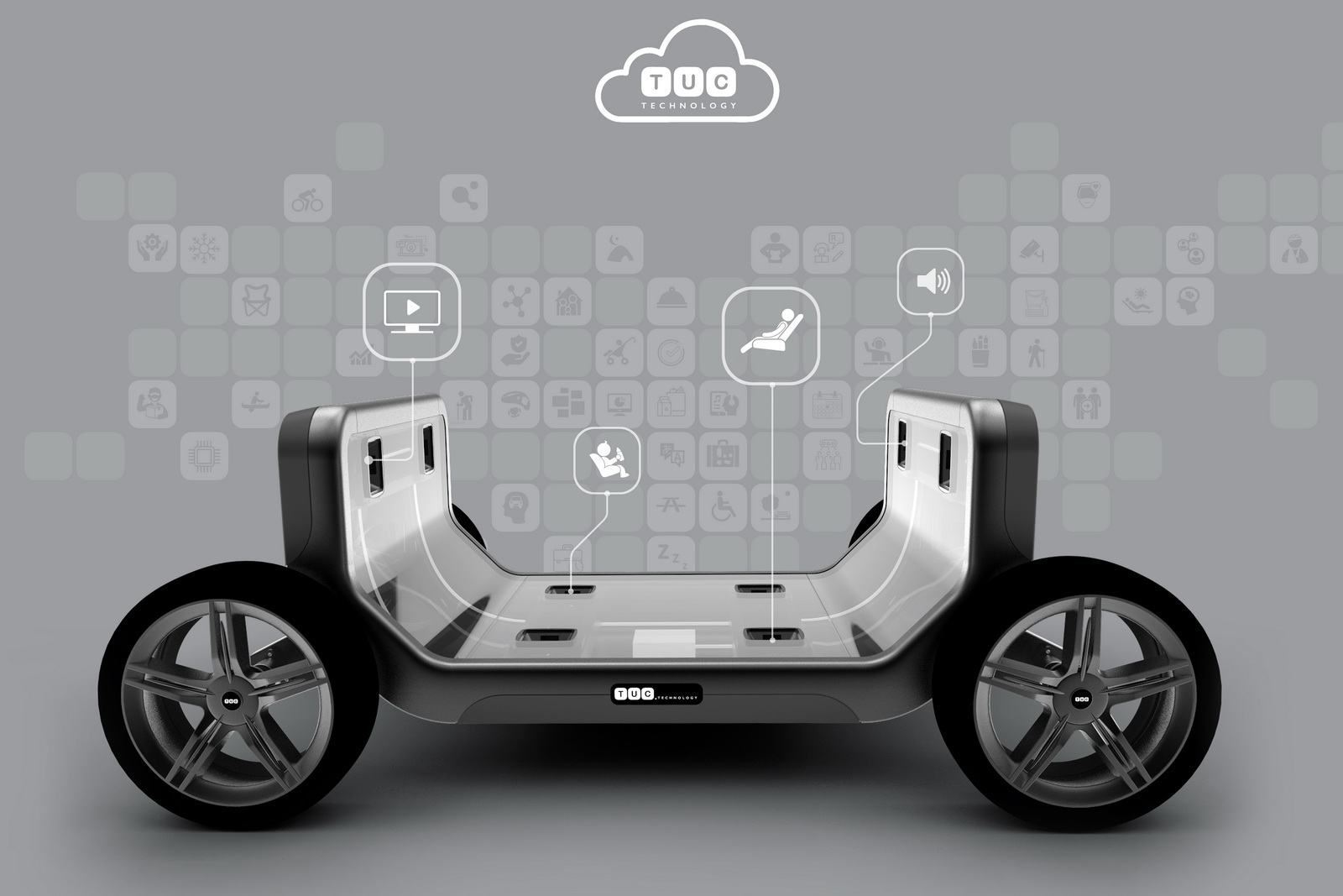 CARROZZERIA DA PERSONALIZZARE - Il progetto TUC.technology ruota intorno a una piattaforma di base facile da modificare, che nei piani dell'azienda può essere personalizzata al momento dell'ordine ma anche dopo. Sul pavimento del telaio scorrono due binari trasversali, dove ancorare i sedili, mentre sulle pareti sono presenti quattro grosse fessure (due per lato) a cui fissare il volante o ad esempio un grande schermo. Questa struttura può essere facilmente modificata: con quattro sedili e un volante si può creare una tradizionale citycar, con un sedile fronte marcia e l'altro ruotato di 180 gradi aumenta il comfort per il passeggero e con due sedili sul binario più arretrato si possono allungare le gambe, una soluzione ideale per un veicolo da città con l'autopilota. La TUC ha lavorato sulla base, perché l'involucro (ovvero la carrozzeria) dev'essere realizzato dalle case automobilistiche.