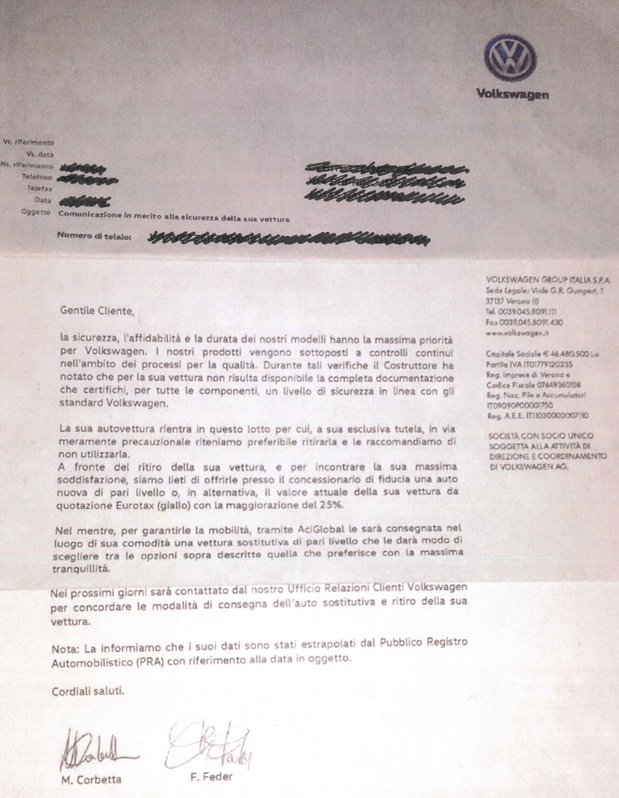 Ad alcuni clienti, la Volkswagen sta offrendo una vettura nuova a costo zero. Non riguarda il dieselgate: il problema è legato alla certificazione interna dei componenti utilizzati.