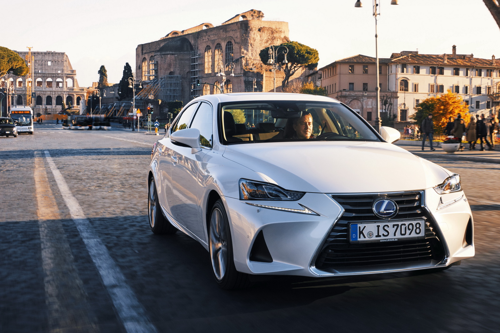 Dopo aver premuto il pulsante di avvio, come in tutte le ibride non si avverte rumore. Si parte in modalità elettrica (a batteria carica), poi il quattro cilindri a benzina si attiva per dare più potenza: a ogni velocità, l’insonorizzazione dell’abitacolo consente è efficace. Per viaggiare in modalità solo elettrica basta premere il tasto EV sul tunnel centrale: la casa promette due chilometri a emissioni zero, a una velocità non superiore a 50 km/h. L’aggiornamento ha reso la Lexus IS più dinamica: le sospensioni anteriori sono state irrigidite, mentre, nelle posteriori, sono nuovi la barra stabilizzatrice e gli ammortizzatori. Rivisti pure la regolazione della servoassistenza dello sterzo. Un po’ scomode, però, le “retro”: in manovra, il lunotto inclinato costringe ad affidarsi ai sensori di distanza.