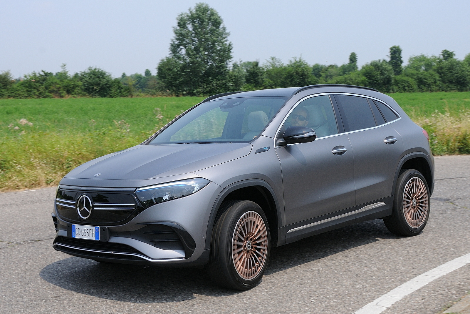 Come tutti i modelli elettrici della casa tedesca, la Mercedes EQA ha una grande mascherina cieca nero lucida, in cui spicca la stella che cela il radar di distanza; è questo il dettaglio estetico che più la differenzia dalla GLA a motore termico, da cui deriva. L’aspetto è moderno soprattutto nel frontale, dove una sottile striscia luminosa unisce i fari full led. Gli originali cerchi di 20” multirazza sono optional; quelli in colore oro rosé e gli interni in pelle bianca fanno parte del pacchetto Edition 1, presente nell’auto del test ma in seguito non più disponibile. L’abitacolo (non piccolo, a differenza del baule) è tecnologico, in particolare nella zona della plancia dove spicca il raffinato sistema multimediale. Su strada si apprezzano lo scatto notevole, soprattutto nei primi metri (poi cala un po’), lo sterzo reattivo e le taratura piuttosto rigida delle sospensioni, che favorisce la guida brillante. Per contro, il pedale del freno ha una risposta poco modulabile e gli spazi d’arresto non sono dei migliori. Inoltre, la batteria da 66,5 kWh effettivi non consente spostamenti molto lunghi: 371 km l’autonomia media rilevata.